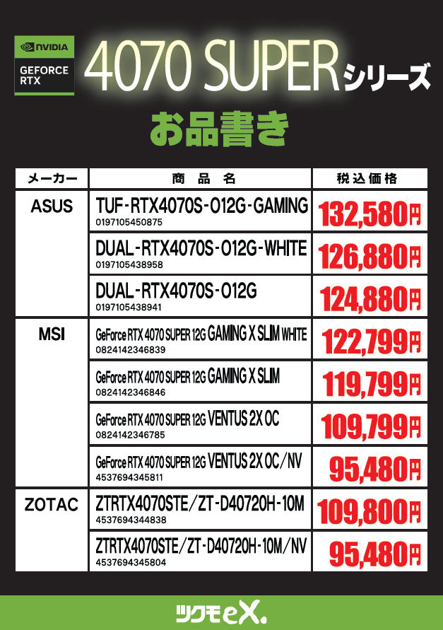 RTX 4070 SUPERのコンパクトなデザインと向上した仕様は、先行モデルに比べて大幅なパフォーマンス向上を実現し、強化されたゲームパフォーマンスを求めるユーザーにとって魅力的な選択肢となっています。しかしながら、国内での販売価格はNVIDIA希望小売価格である86,000円を上回っており、パソコン専門店ツクモeXでは最も安い製品でも95,480円となっております。
